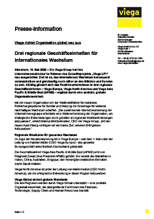 Mit der neuen Organisation will der Weltmarktführer für metallene Rohrleitungssysteme für Sanitär und Heizung die Grundlage für weiteres nachhaltiges Wachstum schaffen. „Die zunehmende Internationalisierung der Unternehmensgruppe erforderte eine Weiterentwicklung der Organisation, um strategische Entscheidungen noch gezielter an regionale Marktanforderungen anzupassen“, erklärt Markus Brettschneider, CEO der Viega Group. „Mit der neuen Ausrichtung verfolgen wir ein klares Ziel: unseren Erfolgskurs fortzusetzen.“