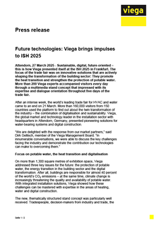 Sustainable, digital, future-oriented – this is how Viega presented itself at the ISH 2025 in Frankfurt. The focus of the trade fair was on innovative solutions that are actively shaping the transformation of the building sector: They promote the heat transition and strengthen the protection of potable water. More than 200 Viega experts accompanied visitors every day through a multimedia stand concept that impressed with its expertise and dialogue orientation throughout five days of the trade fair.